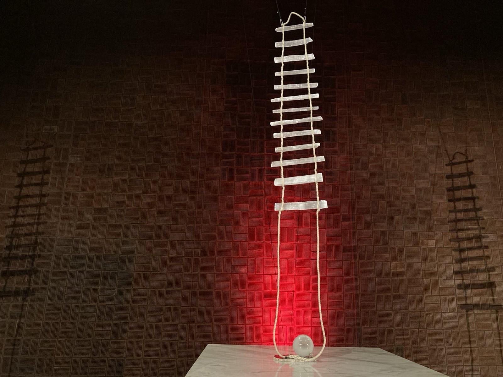 Sie hängt! Die Installation DAS LICHT SIEGT ÜBER DAS DUNKEL, eine im Raum schwebende Leiter aus Selenit (Marienglas) wurde vorgestern für die Ausstellung PEACE OF ART in den Tanz mit der Schwerkraft gebracht. Es ist mir eine große Freude, dass sie im September hier zu sehen ist: